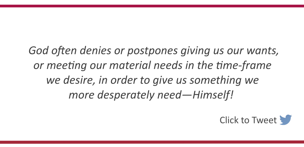 - God often denies or postpones giving us our wants, or meeting our material needs in the time-frame we desire, in order to give us something we more desperately need—Himself!